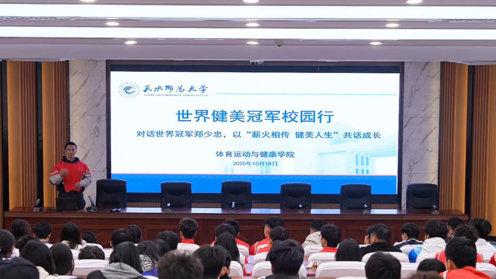 首场活动在学校报告厅举办,郑少忠作题为《健美备赛与健身健美专业发展就业指导》的专题报告。他结合自身多年征战赛场的经历,将健美备赛技术倾囊相授——从备赛周期的科学规划、不同阶段的饮食营养精准搭配,到训练强度的动态调控与心理状态的稳定调节,每一个环节都讲解得细致入微。同时,他还结合当前健身行业发展趋势,为相关专业学生梳理职业发展路径,提供清晰的就业方向指引与规划建议。