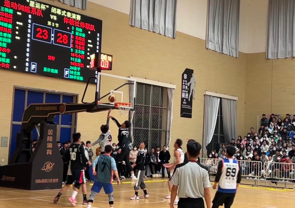 本次篮球赛各参赛队充分发扬“友谊第一、比赛第二”的体育竞技精神,以精湛的技术,团结拼搏,奋勇争先,充分展示了良好的精神风貌。每场比赛都吸引了众多学生前来观看。一幕幕精彩的竞技比赛,赢得在场观众阵阵掌声和喝彩声。在闭幕式上,组织了运动训练队VS体教社体联队表演赛。